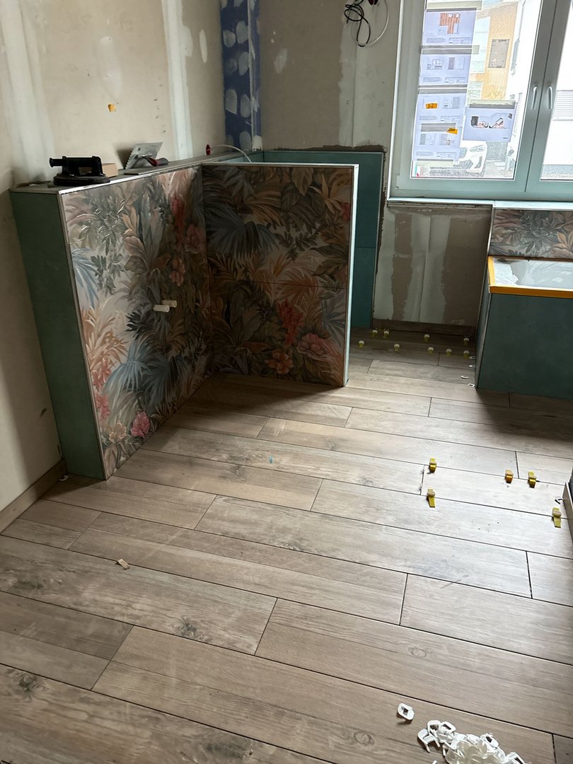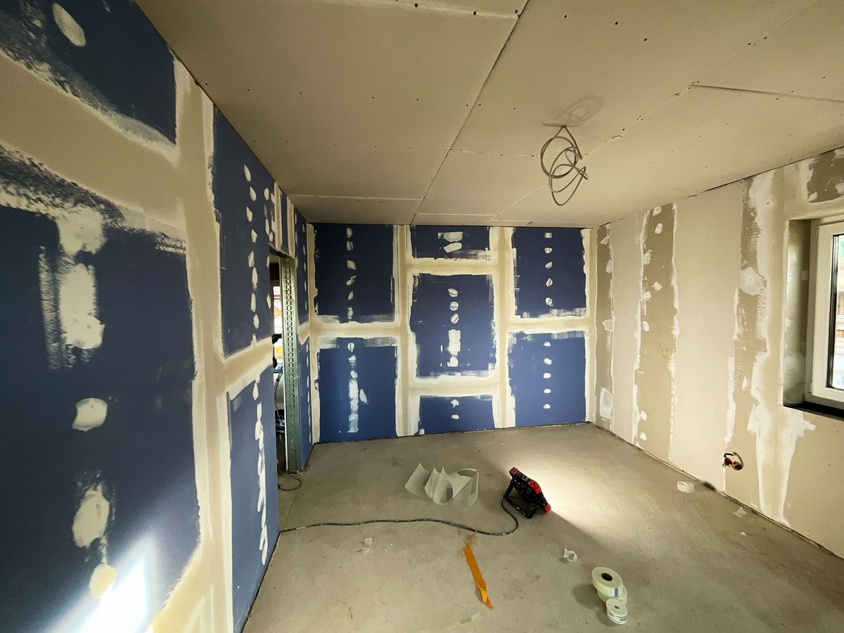 Trocknungsphase abgeschlossen, Bemusterungsware angeliefert, Spachtelarbeiten gestartet