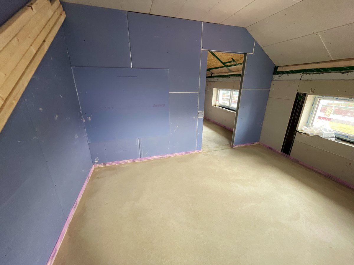 Hausstellung erfolgt, Rohbau abgenommen, Trockenbauer hat mit Dachdämmung begonnen
