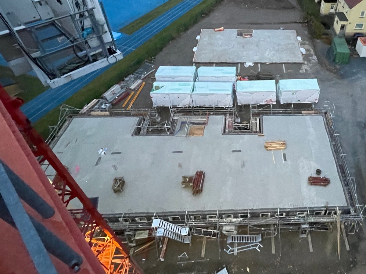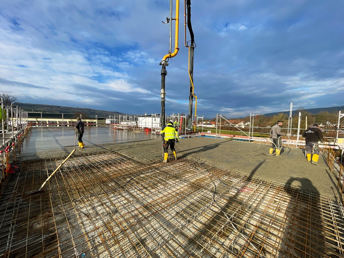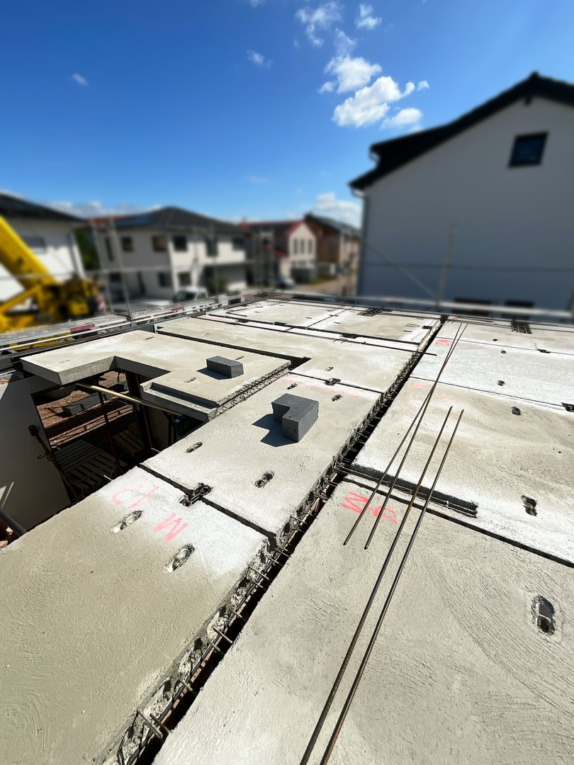 Hausmontage des Erdgeschosses gestartet, Betondecken verlegt, Obergeschoss in KW03 terminiert