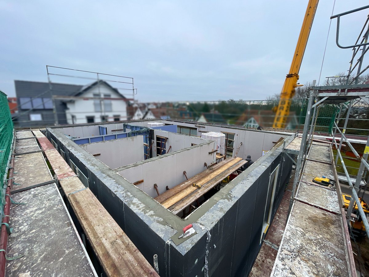 Hausmontage des Erdgeschosses abgeschlossen, Betondecken verlegt, Obergeschoss in Ausführung