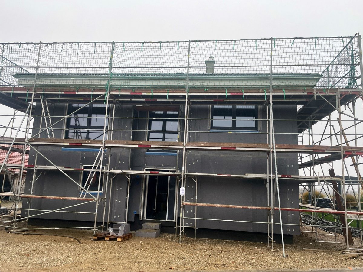 Rohbau abgeschlossen, Dachkonstruktion sowie Eindeckung fertiggestellt, Dachdämmung wird derzeit eingearbeitet, Start Elektroarbeiten